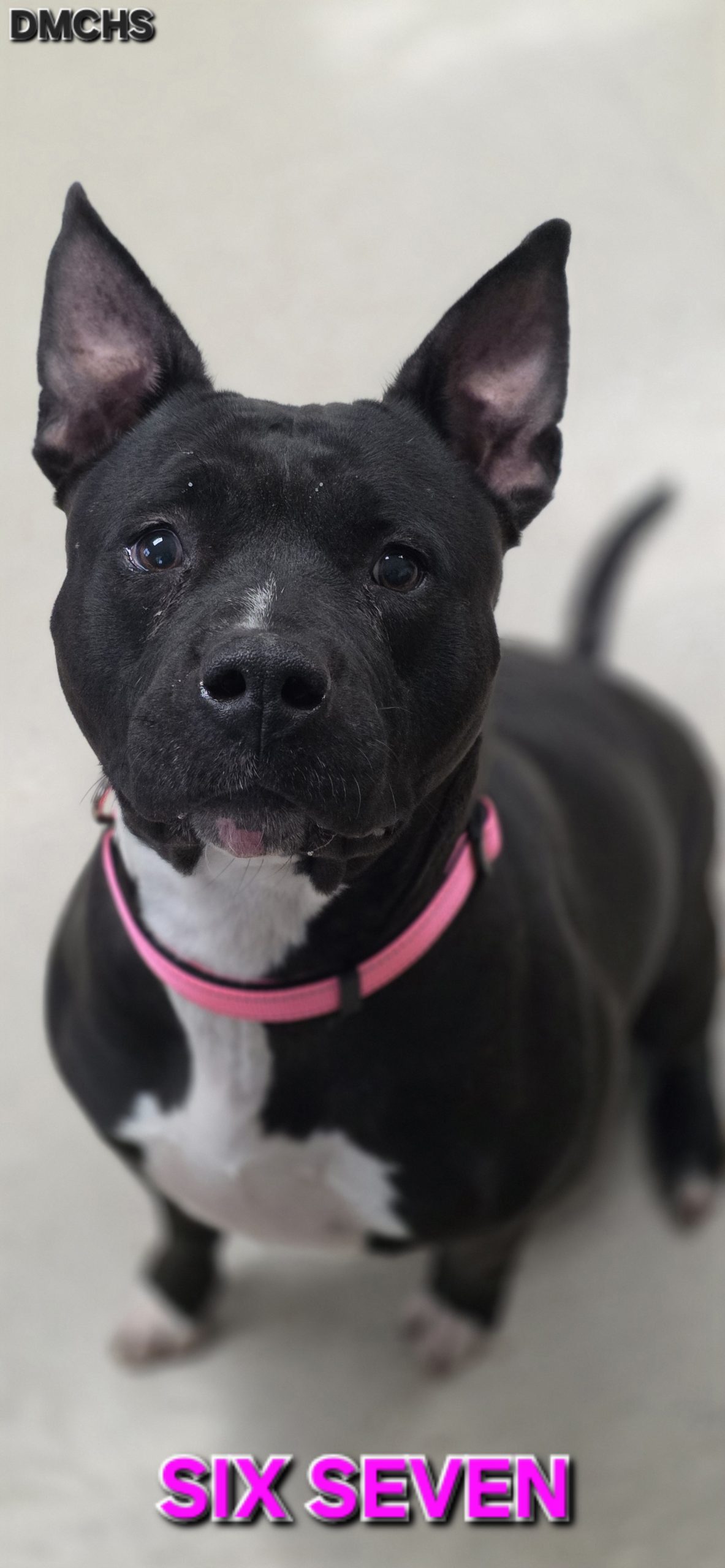 Six Seven is a 5 year old black and white female Pit Bull Terrier. Six Seven is a big gal with a big heart, she is learning to not pull us around on the leash, she doesnt think she is that strong, but she is. She is cute, funny and all the tail wagging she can do when she is excited!