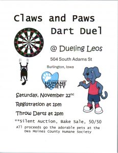 22nov1:00 pm6:00 pmClaws and Paws Dart DuelJoin us for a Dart Tournament