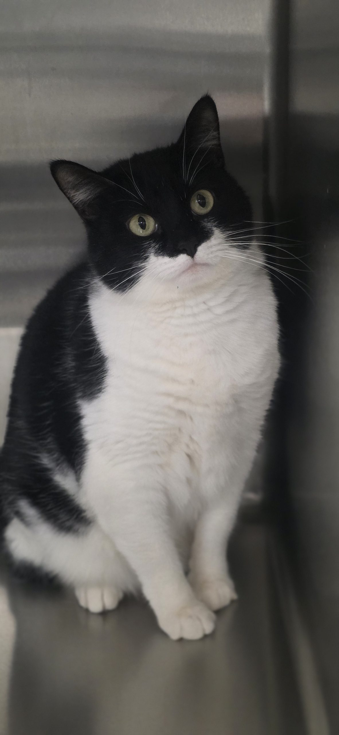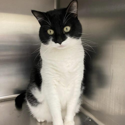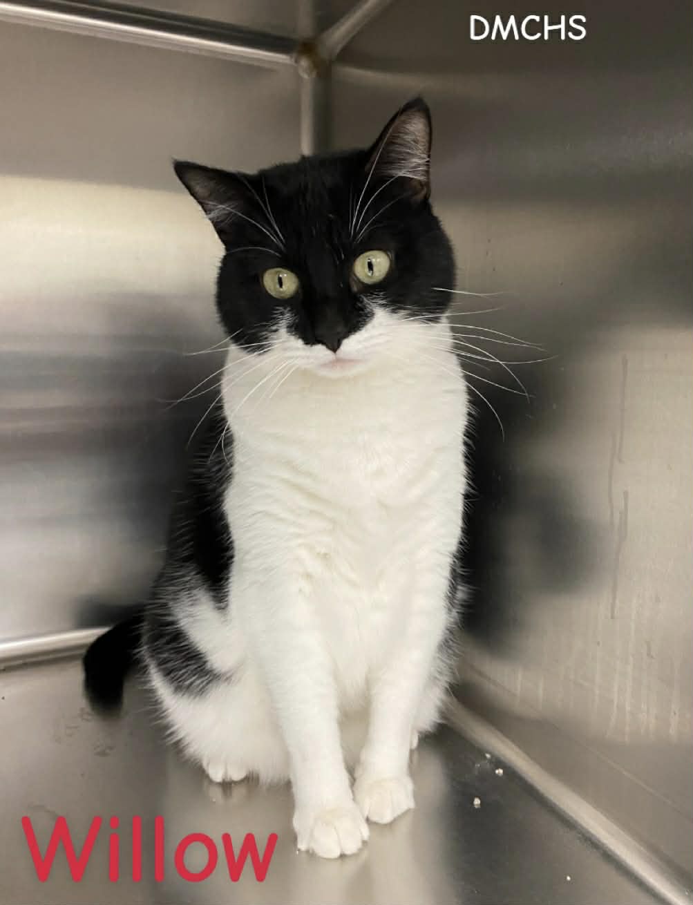 Willow is a female 2 year old tuxedo kitty. Willow likes to play and eat her treats. She can stare at you for quite some time, and then you can not resist picking her up and loving on her. She is adjusting to being around other cats ok..