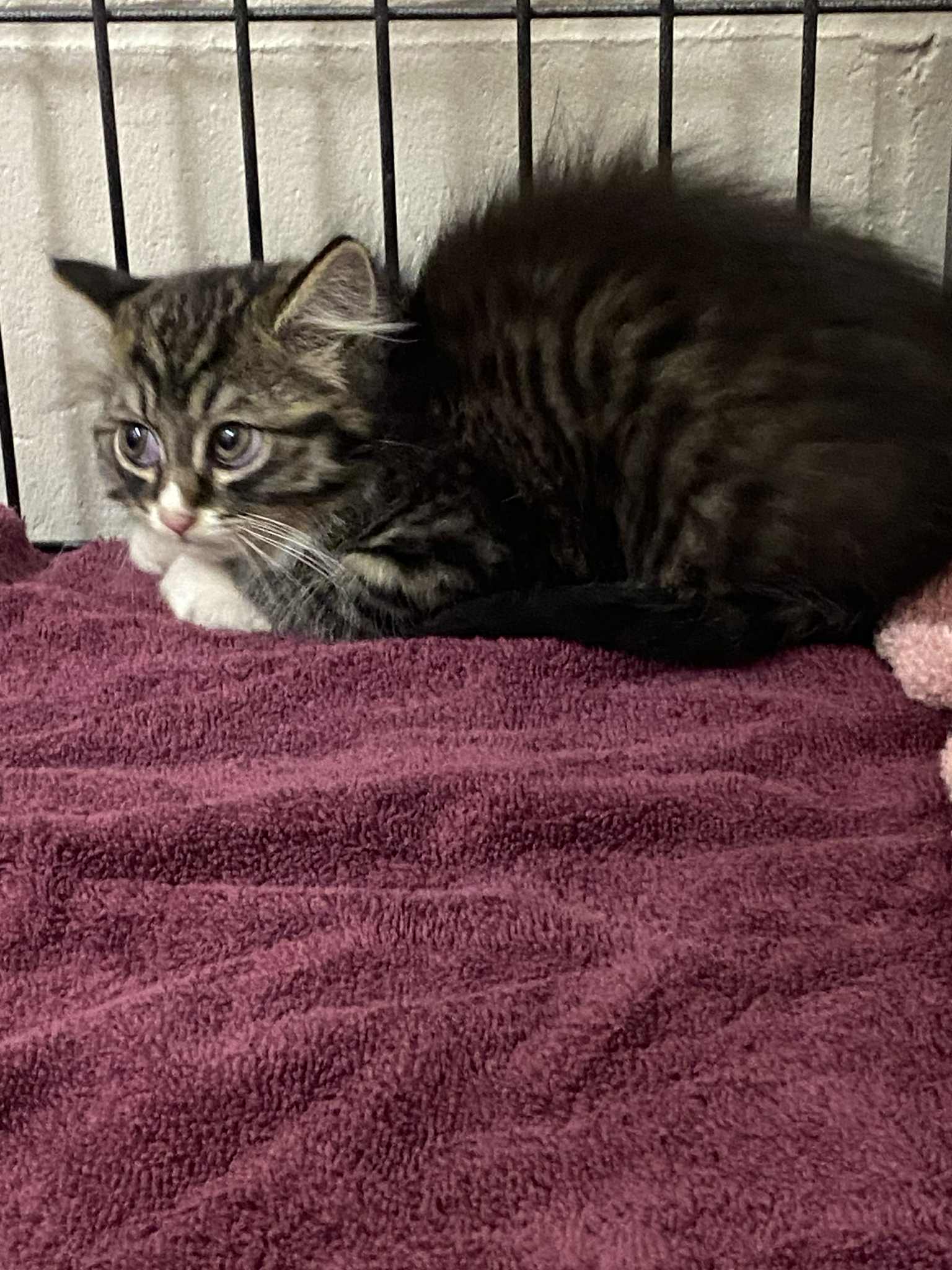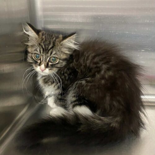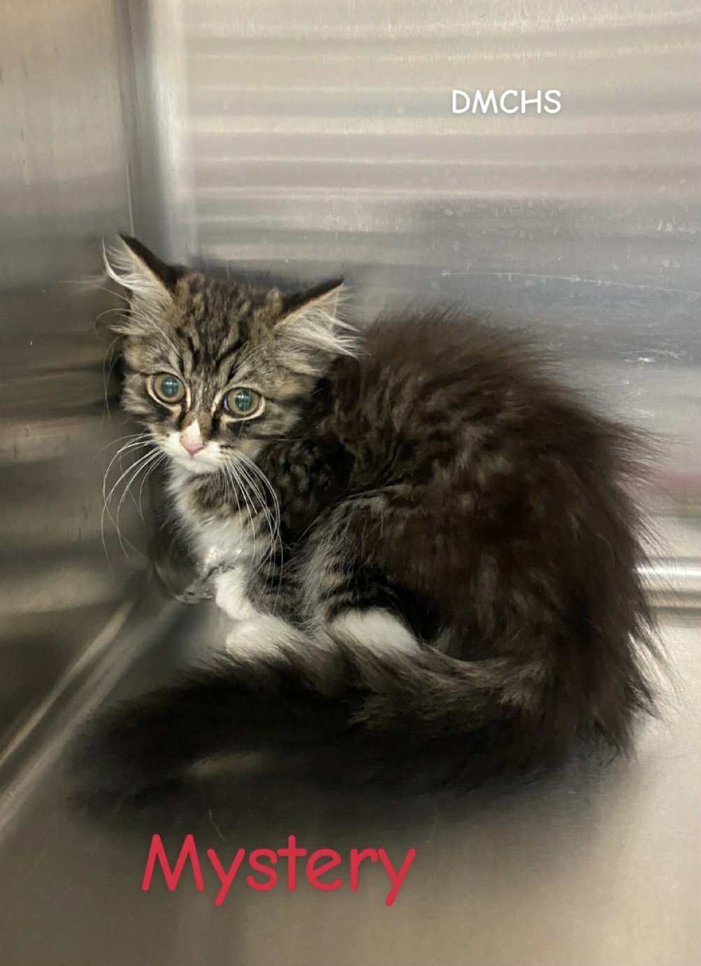 Mystery is a 3 month old male white and grey tabby kitten. Mystery is sweet, likes to be held, still a bit shy, but with the right amount of love he will blossom!