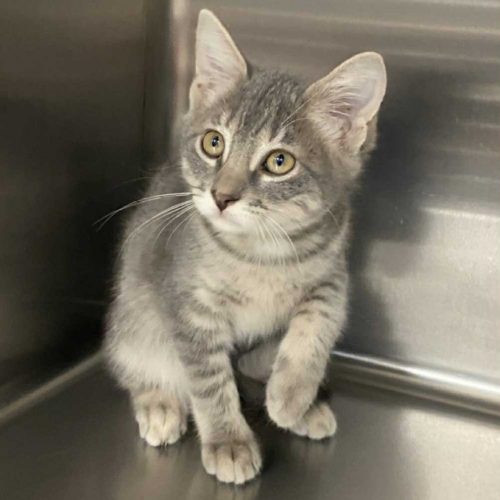Leaf is a 2 month old female grey tabby kitten. Leaf is playful, cute and loves cuddles