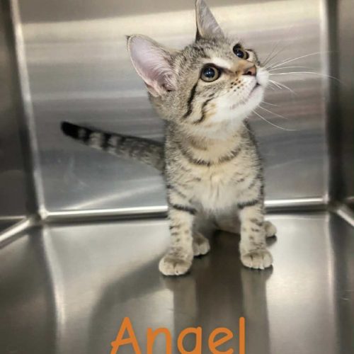 Angel is a 3 month old female grey tabby kitten. Angel is outgoing, wants all the attention and has alot to say. Once she gets her cuddles she will calm down!