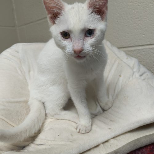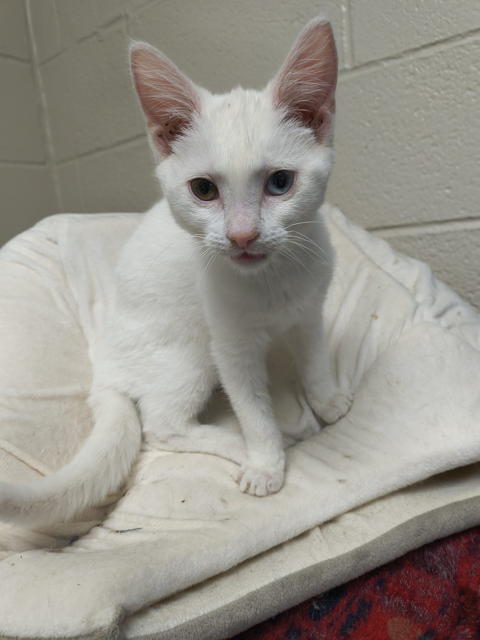Chi is a 3 month old white female kitten. Chi is a wild child, came to us just a dink with the will to fight, she is just that! She is a nibbler, plays crazy, just loves all the attention and will do zoomies when she sees the need. Her eyes are 2 different colored... just all around fun, crazy but cute kitten.