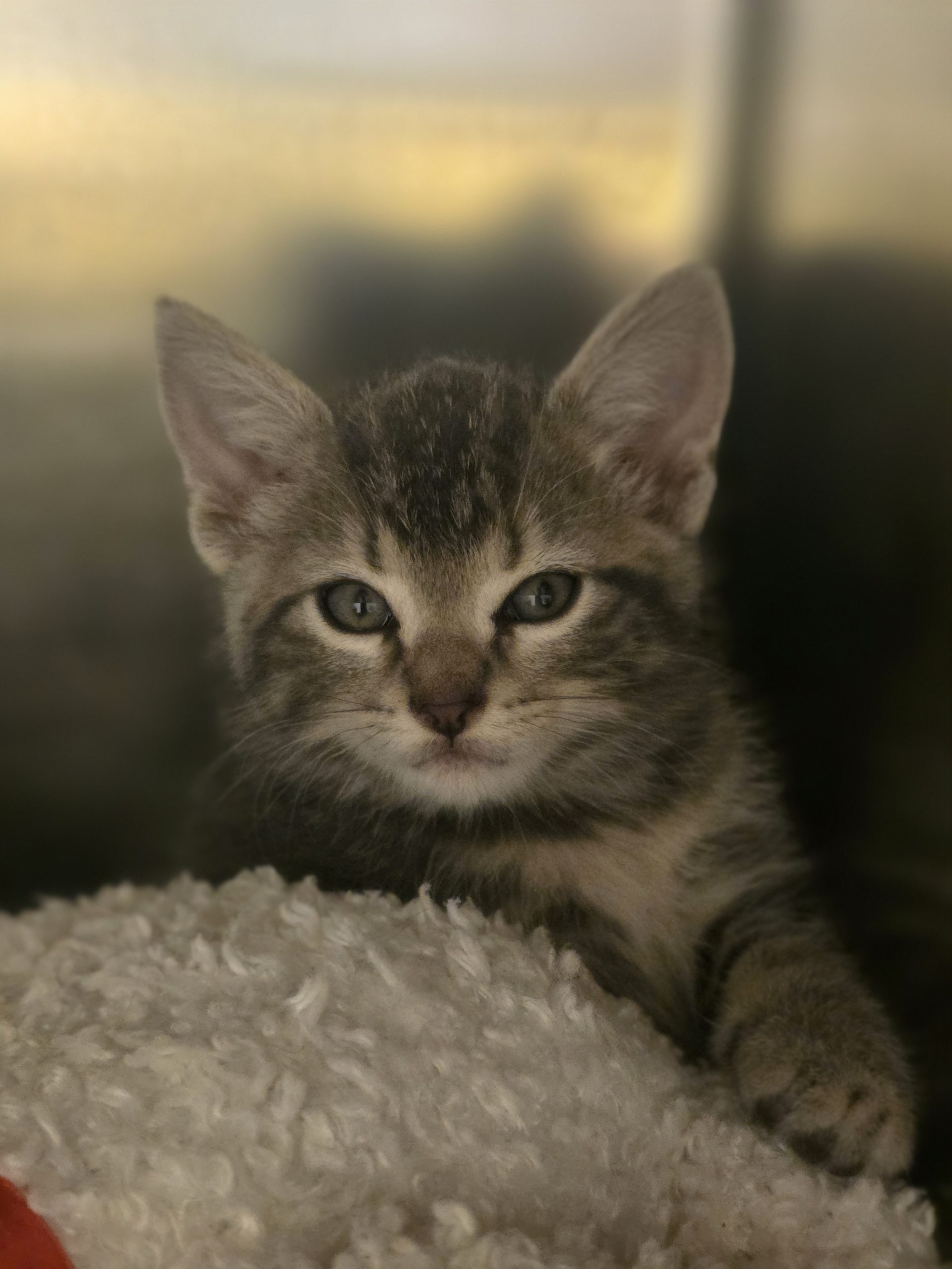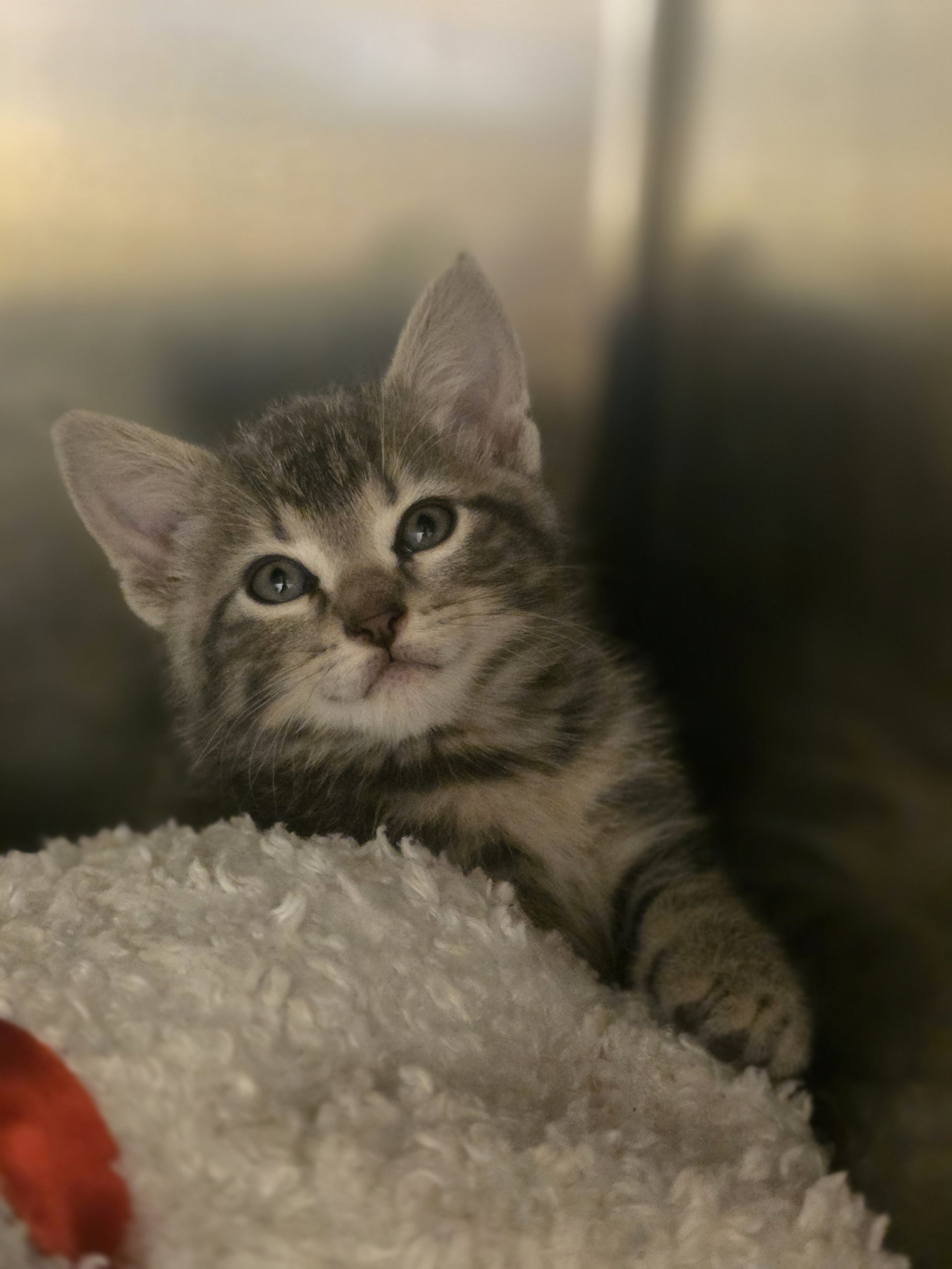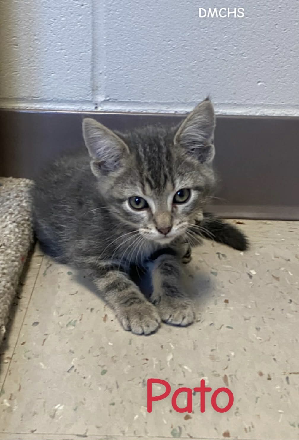 Pato is a 2 month old male grey tabby kitten. Pato is sweet and playful, super cute when he is playing or staring at you about to fall asleep!