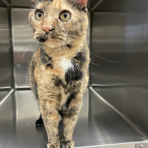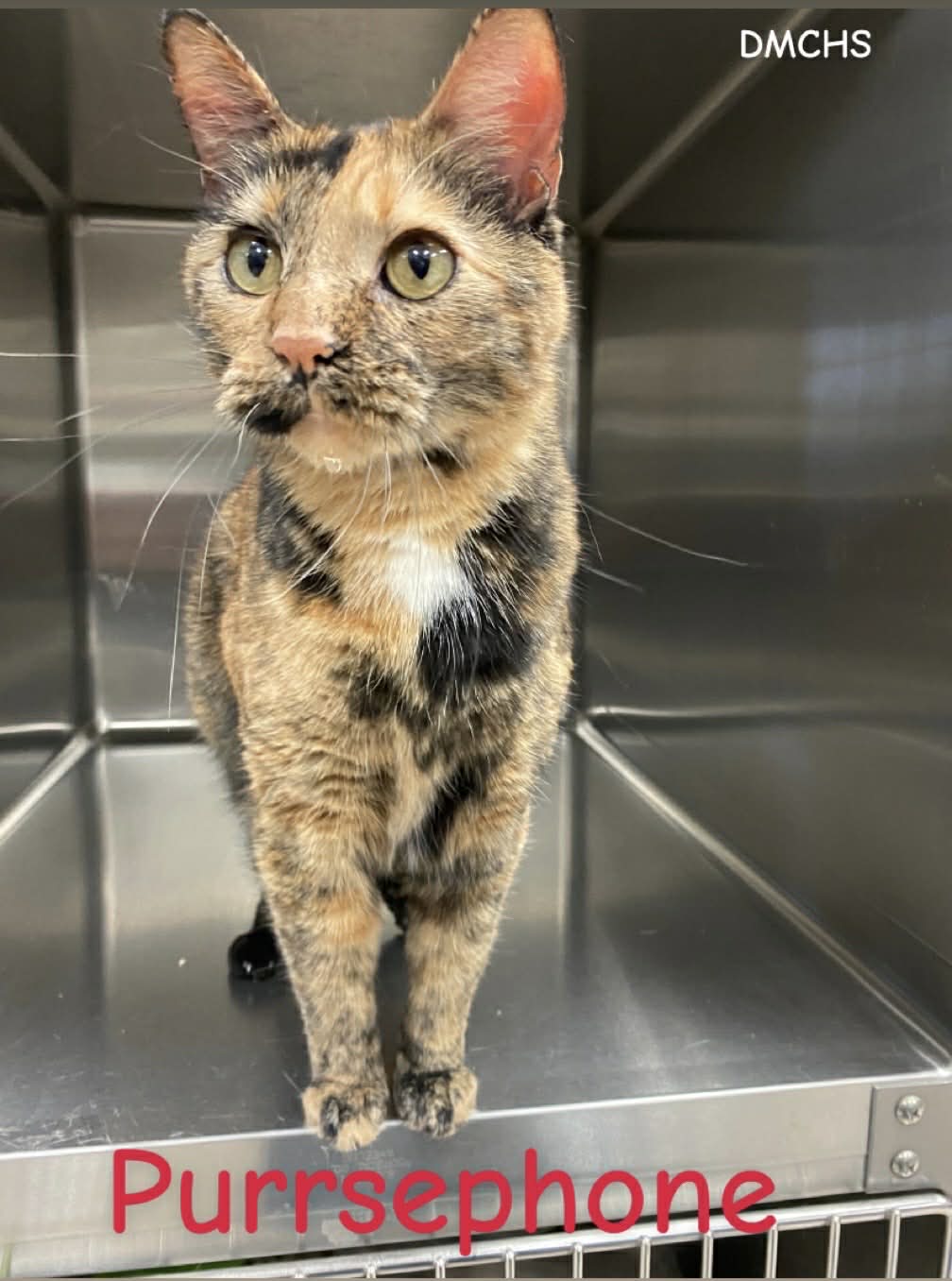 Purrsephone is a 5 year old female tortie kitty. Purrsephone is soft, sweet and loves to be petted and even held. She plays with toys some, she is somewhat serious at all times lol!