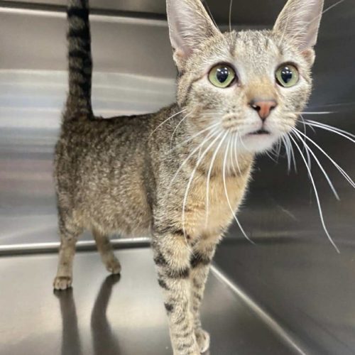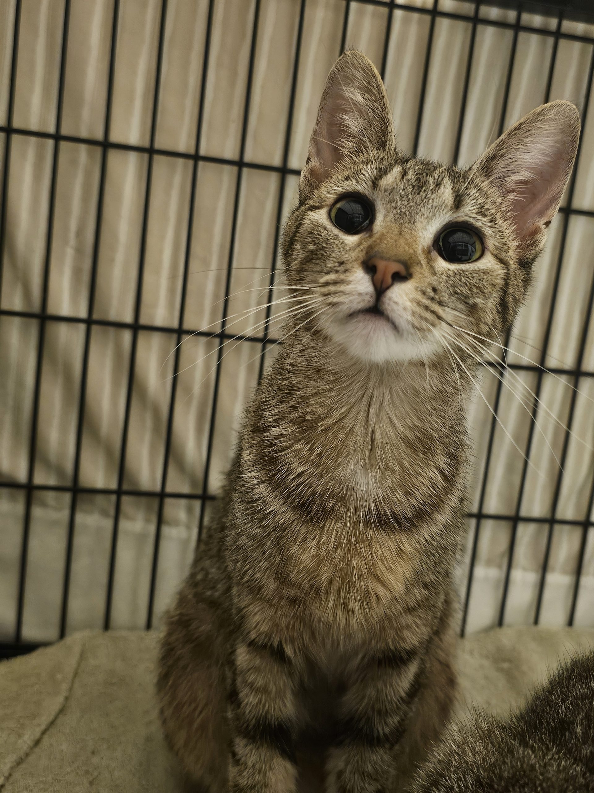 Rascle is a 1 year old female brown tabby kitty. Rascle is playful and cute, loves her treats and patting toys around.