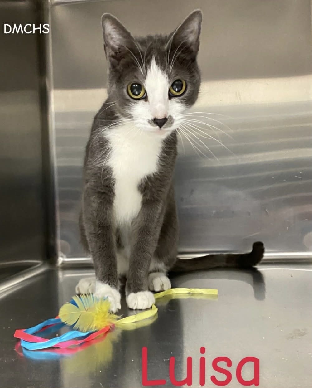 Luisa is a 3 year old female gray and white kitty. Luisa is a pretty gal, loves to talk about her day, and enjoys all the love she can get.