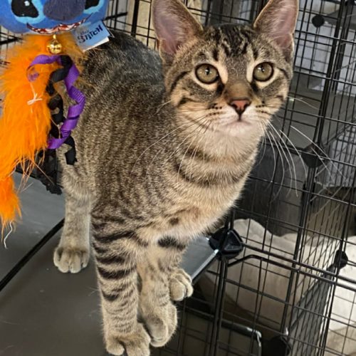 Felix is a 4 month old male brown tabby kitten. Felix is soft and loves to cuddle, so curious too! Loves the treats and toys.