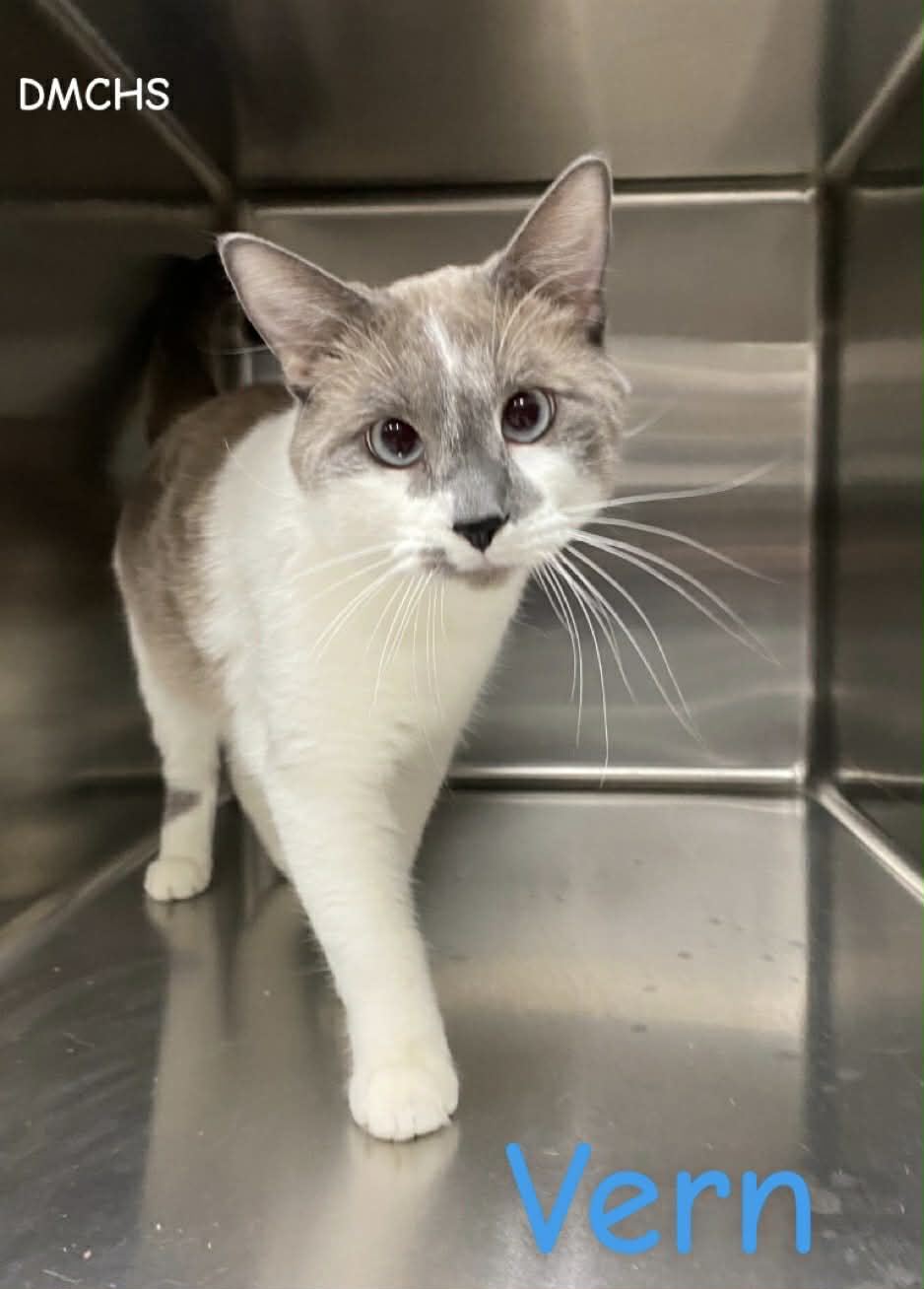 Vern is a 5 year old male gray and white kitty. Vern is a big boy and has cute markings, he likes to talk, play and pounce, but a good petting is his fav!