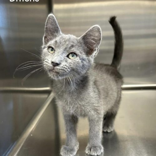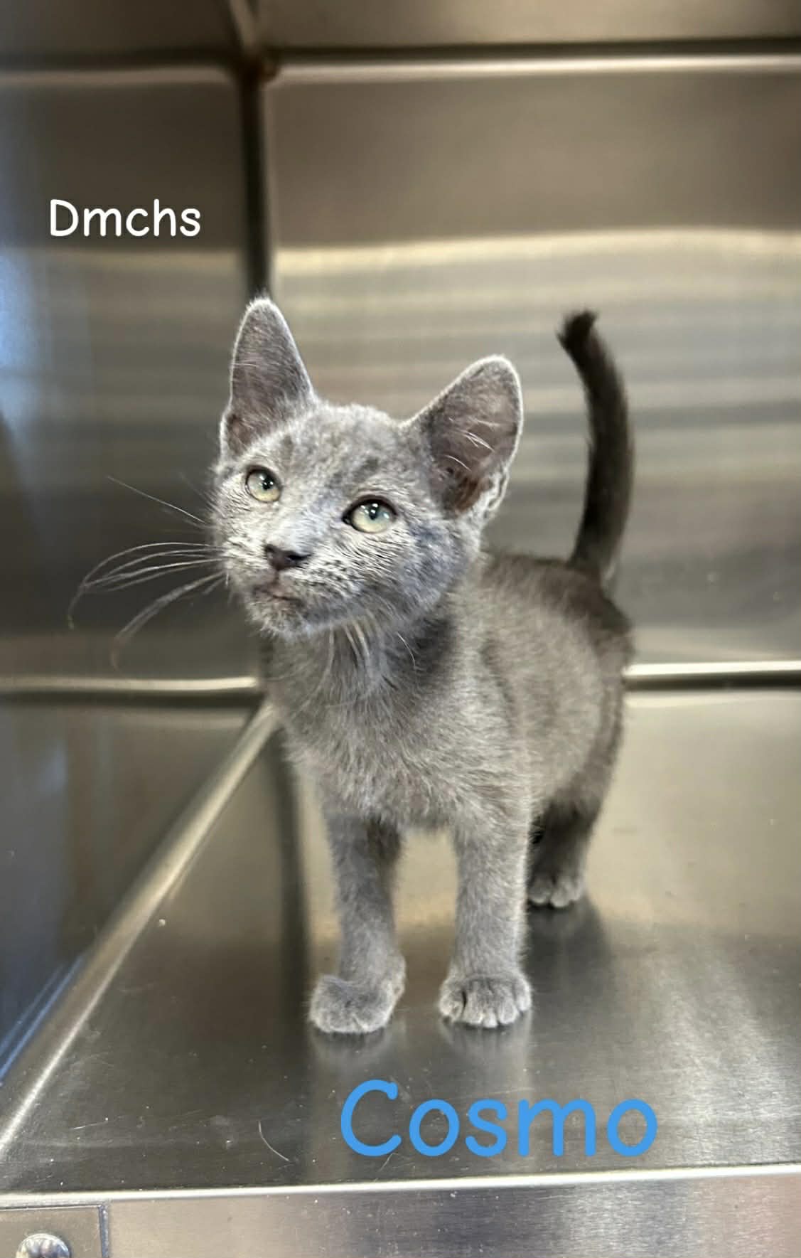 Cosmo is a 2 month old male gray kitten. Cosmo is cute, playful and loves to be loved on.
