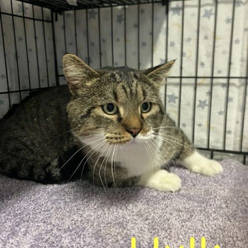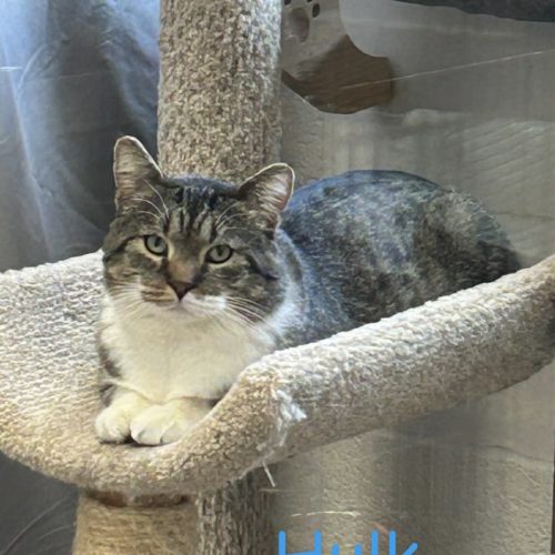 Hulk is a 3 year old male brown and white tabby kitty. Hulk is a big boy, loves to be petted and talked to. He is happy napping and exploring when he is not.
