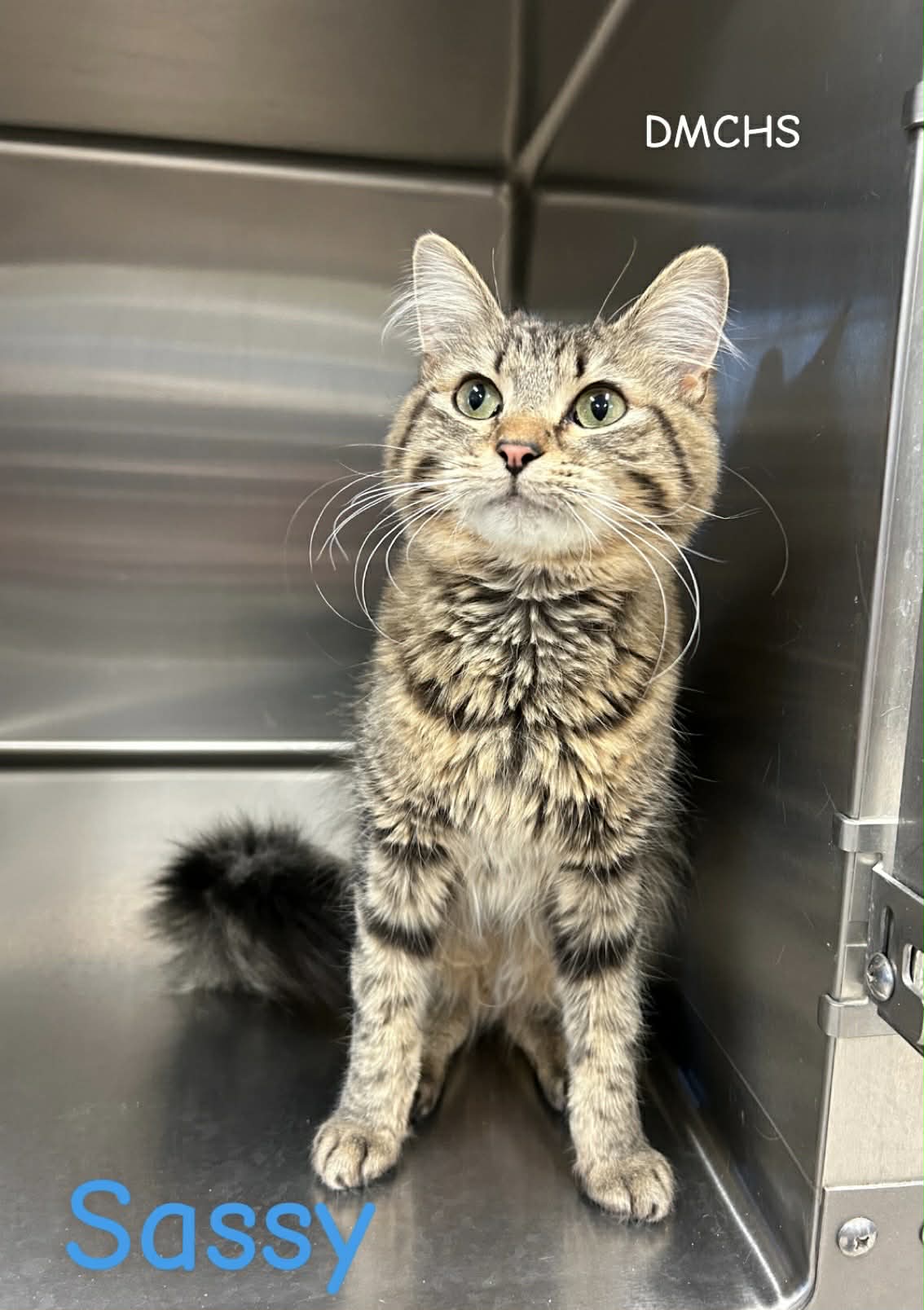 Sassy Pants is a 8 month old female brown tabby kitty. Sassy Pants is cute and sassy, she likes to get petted, just not around other cats. She has pretty fur that will need brushed, and she knows how to use her hisser if she wants, not for anything in particular!