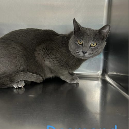 Desmond is a 3 year old male gray kitty. Desmond is a bigger, handsome fella, he has his nap side and his play side, his cute black nose is a good booper too!
