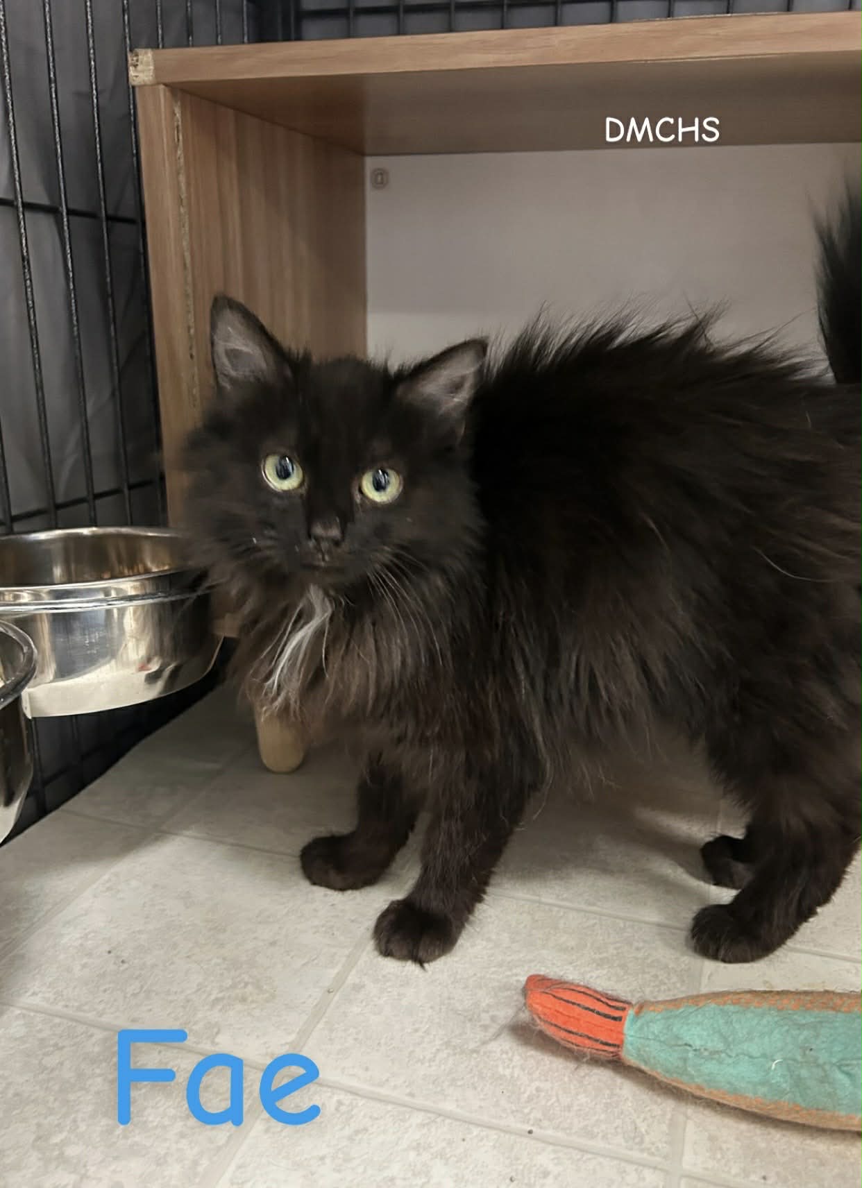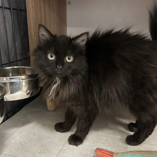 Fae is a 6 month old long haired female kitten. Fae came to us as a little gal that bit her finder, this scared gal was told by her parents to not trust us humans, she had mattes in her fur and was a bit rough around the edges. Now she is understanding humans pets feel so good, she loves to play, her fur is growing back from all her mattes and she is ready to entertain and love her new family!