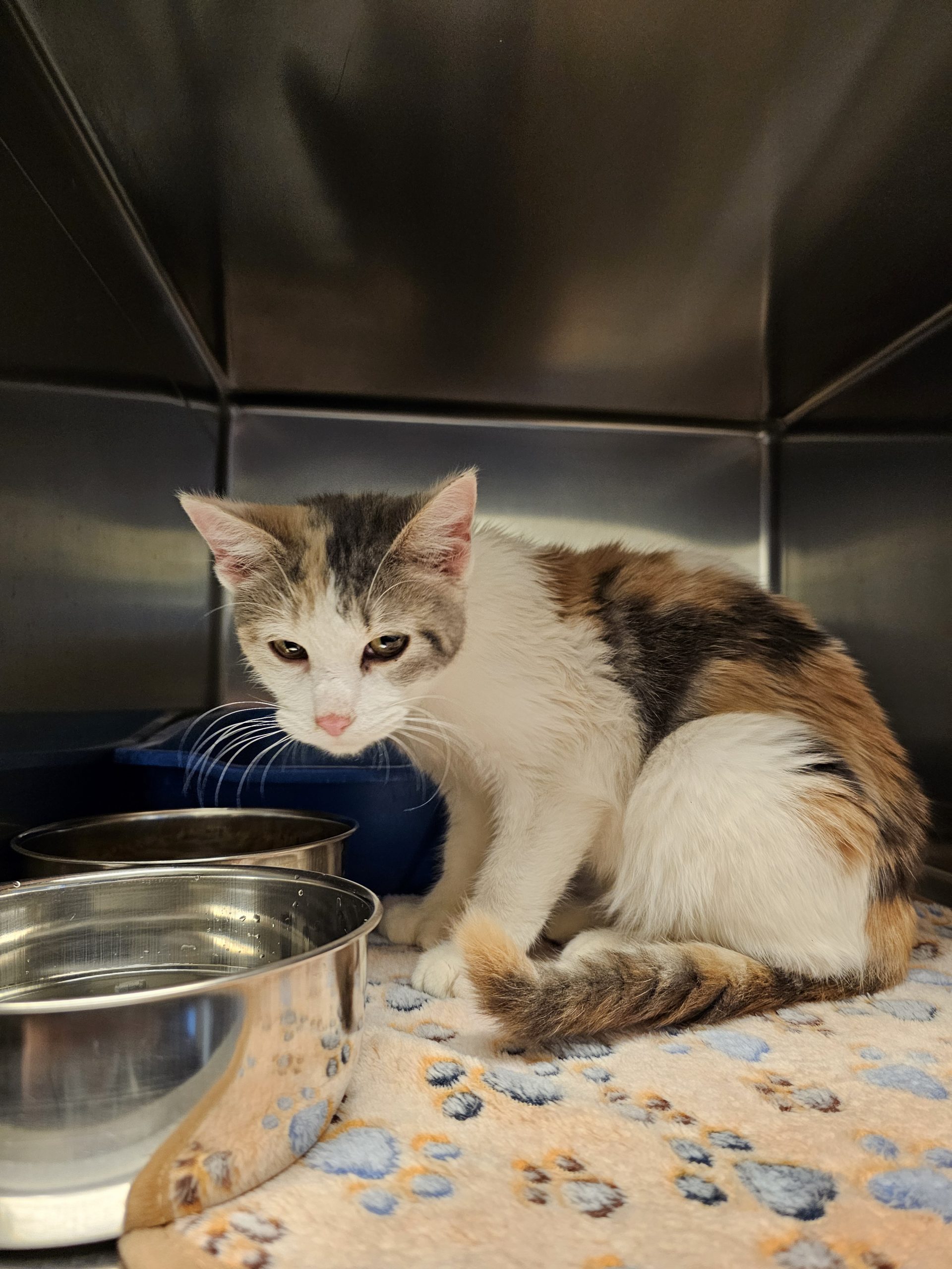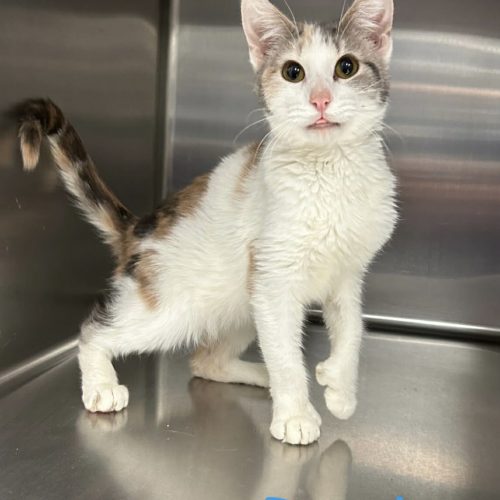 Darla is a 5 year old female calico kitty. Darla is a little gal, and also a poly dactyl with extra toes! She is a lover and loves to be held tight against you for safety. Super fun gal with alot to meow about!