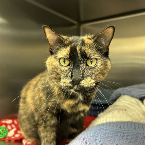 Bella is a 9 year old female tortie kitty. Bella is a pretty gal and is set in her ways in some sorts, she is declawed, likes to have her bed to lay on, do not take it away that is her throne. She loves cat nip, treats and a good petting, she used to go on car rides with her mom before she passed, she has been down about her moms passing, but she is learning to cope better each day. Super pretty gal that wants to be loved on and out of this loud place so she can relax again.