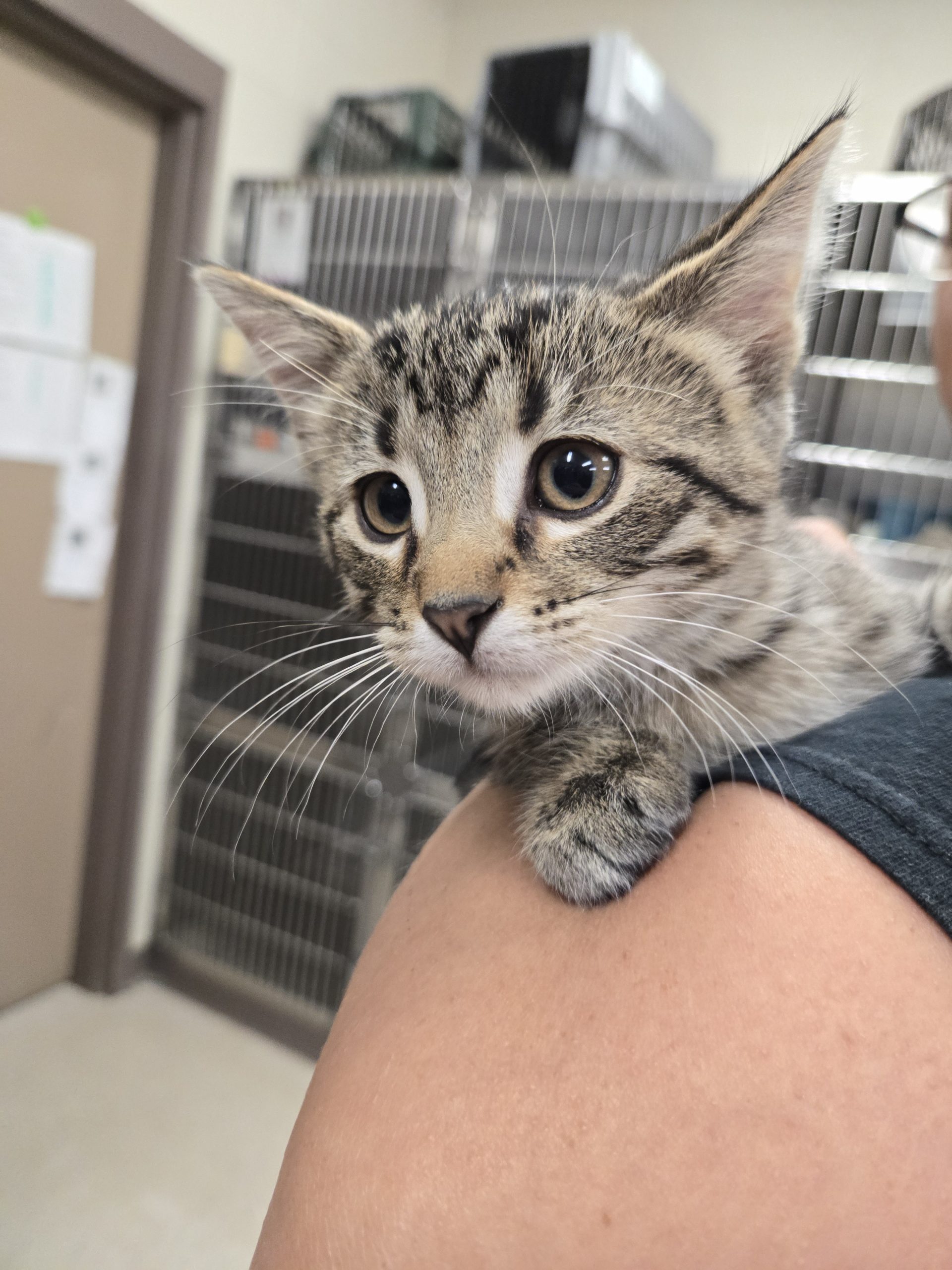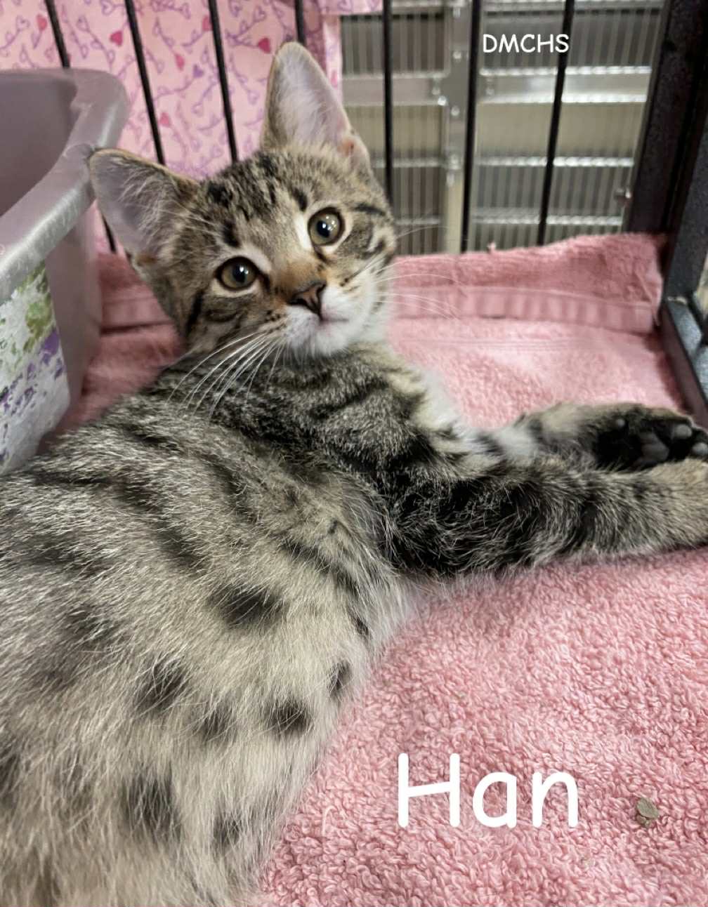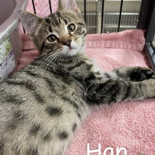 Han is a 3 month old male brown tabby kitten. Han is sweet and sometimes shy, his cute little face makes you want to just scoop him up and love him up!