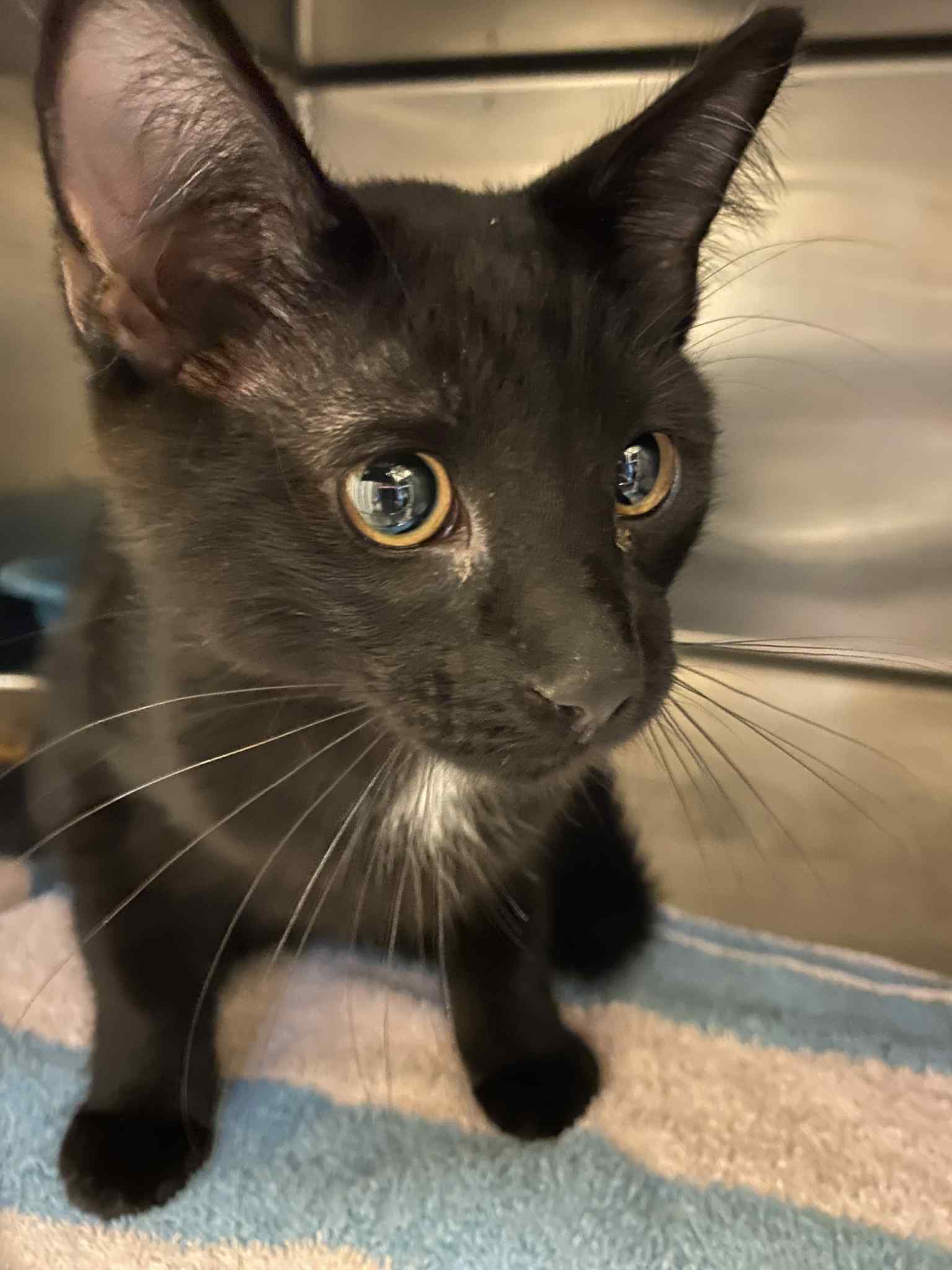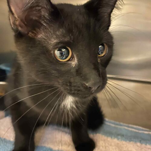 Johnny Blackhawk is a 5 month old male black kitten. Johnny Blackhawk is a curious yet playful kitten, he is really wanting to be held and played with at all times, he is not understanding we have so many kitties that it is hard to just love on him!! Someone come get him and give him this attention he needs!